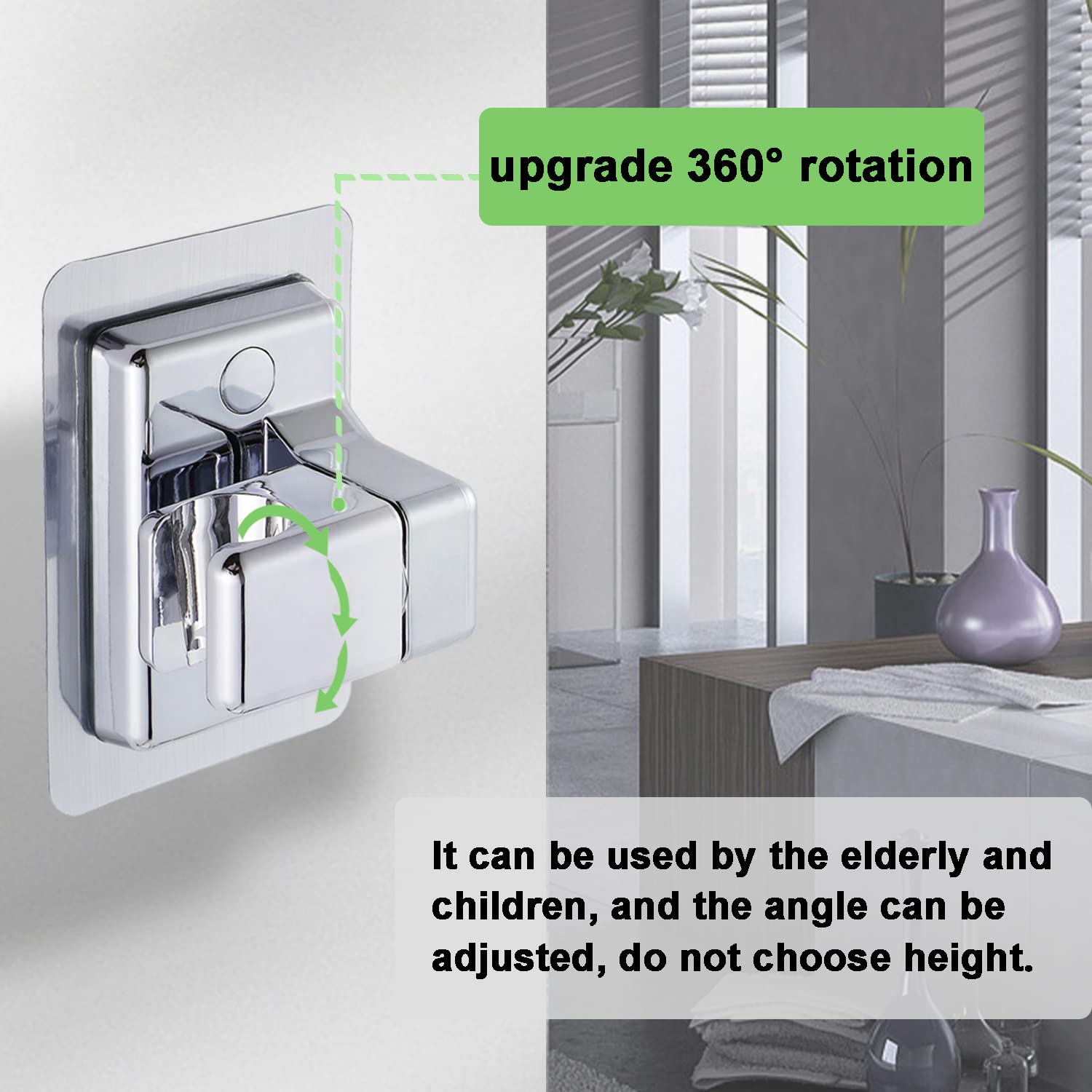 El soporte gira 360° y se puede inclinar hacia arriba y abajo, así que ajustas la altura y dirección de la alcachofa a tu gusto.
